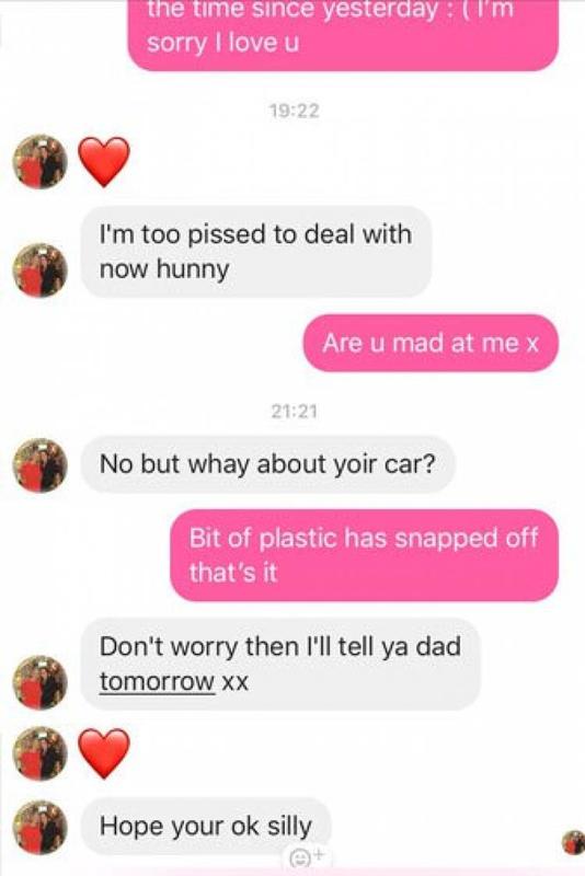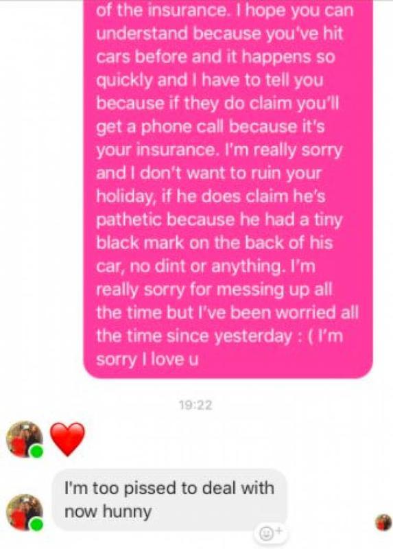 Understandably, Liv went into panic mode when this happened and her first thoughts of worry were - how will her mom react to the situation. This is what she texted her: "I have to tell you because if they do claim you'll get a phone call because it's your insurance. I'm really sorry and I don't want to ruin your holiday if he does claim he's pathetic because he had a tiny black mark on the back of his car, no dint or anything."