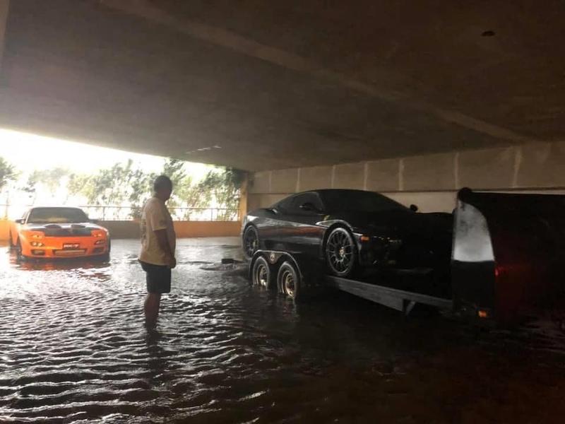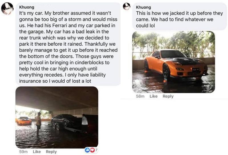 By the time Austin Owens was done, the RX-7 was safe. There were two other cars in peril as well, however, including a BMW and a Ferrari. Luckily the owner of all three cars eventually came with a trailer and towed away the Ferrari, followed by the RX-7. The fate of the BMW is unclear, but is presumed wet.
