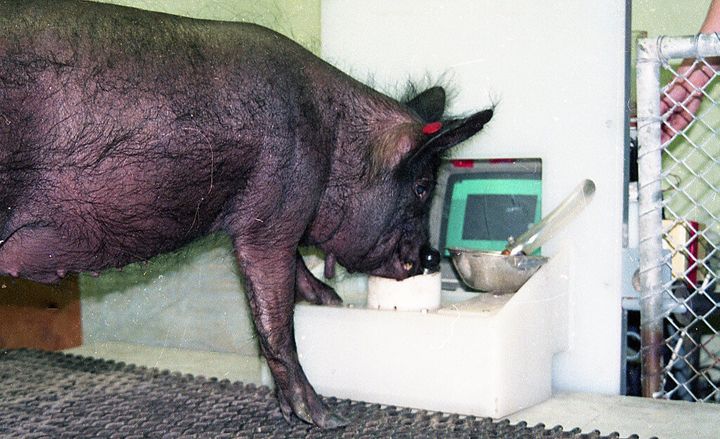 The pigs were tasked with using a joystick to operate a computer cursor, and of course, instead of their hands, they used their snouts. Since food is the quickest way to a pig’s heart, they were given a snack if they achieved their goal. The game even had different difficulty settings so that the pigs had less targets to hit the further they went along in the game. They actually did well too! One of the pigs had a 76% accuracy rate with single targets.